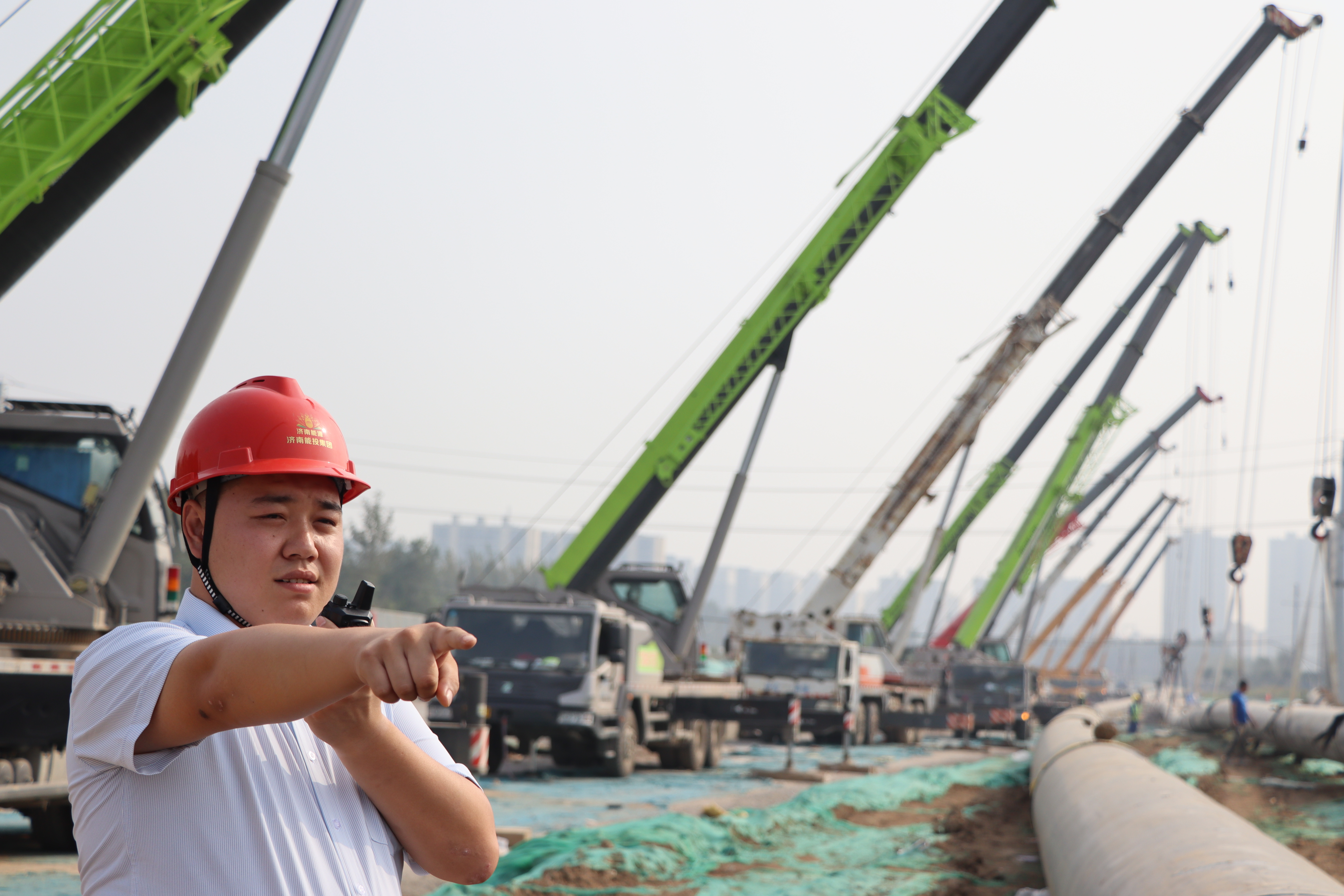在商西路供熱管網(wǎng)項目施工現(xiàn)場,一排排吊車正在緊張作業(yè)。據(jù)了解,該項目主要解決張趙、竇何、蘇龐、孟于等四個安置區(qū)居民冬季采暖問題,現(xiàn)場因涉及綠化保護,需進行過河拉管施工,拉管總長度為540米,涉及管道管徑為DN700,施工難度較大。10月2日,濟南市商河恒泰供熱有限公司經(jīng)多方協(xié)調(diào),緊急調(diào)用19輛吊車對540余米供熱管道進行吊管拉管作業(yè),期間將使用對講機統(tǒng)一調(diào)度,周密配合,確保工期按時完成,保障采暖季居民的正常用熱。
