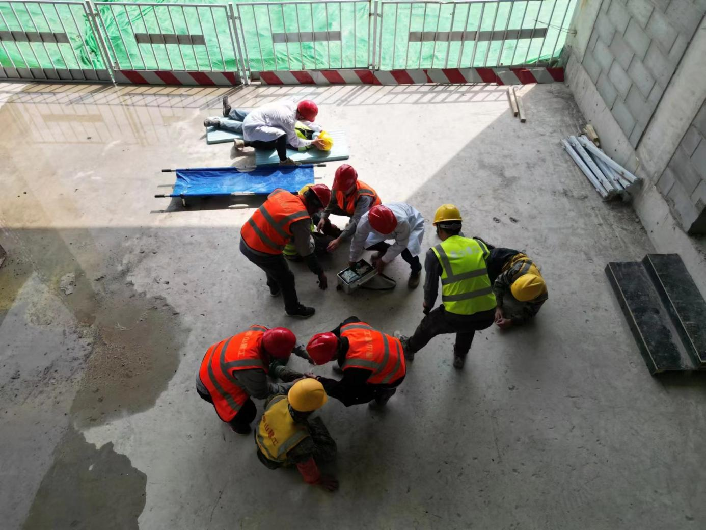 和同信息的智慧能源設(shè)備生產(chǎn)基地建設(shè)項目是濟南市“項目突破年”的重點工程,也是安全監(jiān)控的重點。安全管理部不僅僅經(jīng)常進行現(xiàn)場檢查,也經(jīng)常根據(jù)進度情況組織相應(yīng)的演練活動?,F(xiàn)在項目已經(jīng)封頂,正在進行二級結(jié)構(gòu)施工,這次演練的內(nèi)容就是高處墜落和物體打擊后的應(yīng)急救治。